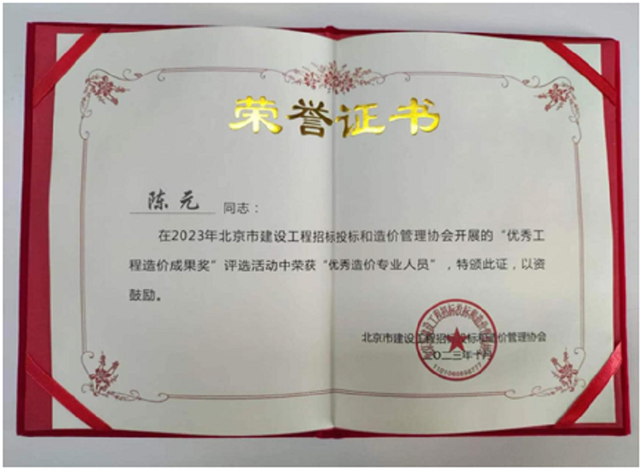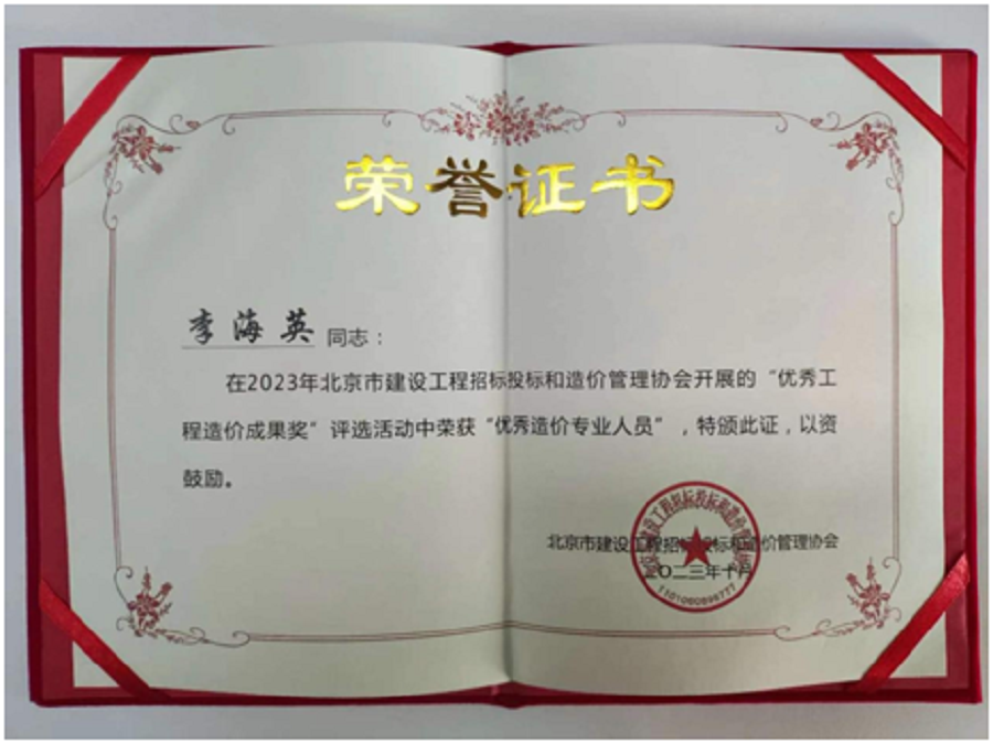 2023年10月在北京市建设工程招标投标和造价管理协会开展的2023年度优秀成果案例评选过程中,开云手机登录入口荣获优秀工程造价成果奖,同时我司造价一部工程师李海英、陈元同志被评为“优秀造价专业人员”。