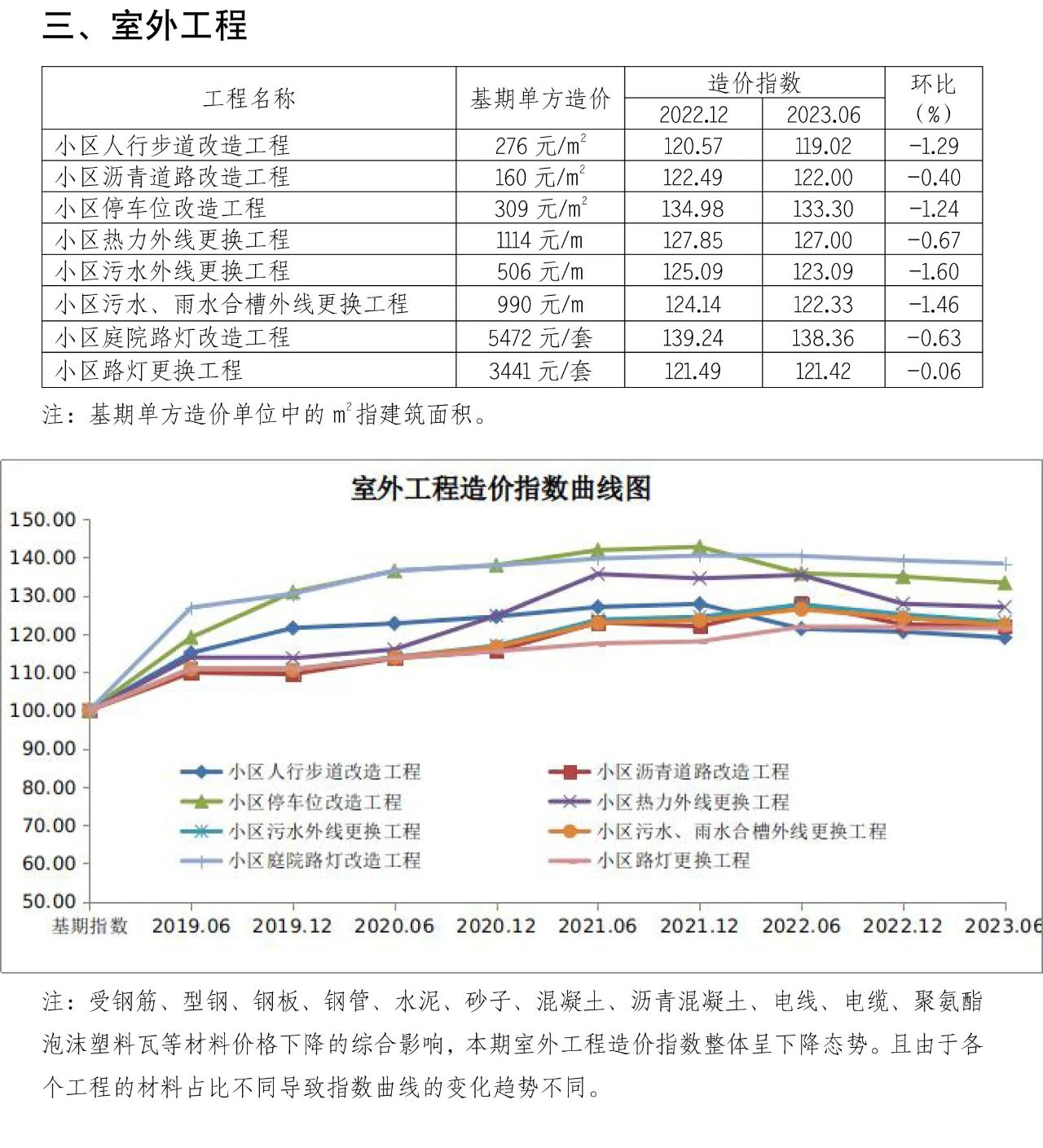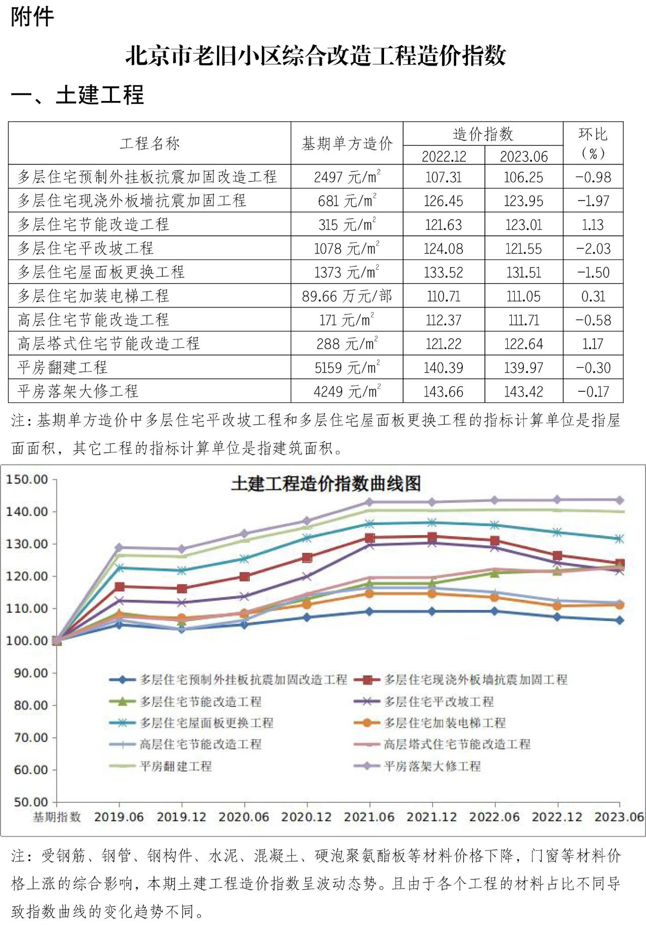 为贯彻落实《关于全面推进城镇老旧小区改造工作的指导意见》(国办发〔202023号)要求,加强对老旧小区整治工程造价的动态指导,为合理确定和有效控制工程造价提供参考,现发布第十二期北京市老旧小区综合改造工程造价指数。本指数在《北京市老旧小区综合改造技术经济指标》(2017)的基础上进行测算,以20169月为基期,201712月为第一期,之后每半年发布一次。20169月的基期造价指数为100,本期人工、材料、机械等价格按20236月的《北京工程造价信息》(房屋修缮工程)确定,未包括的材料价格参照同期市场价。