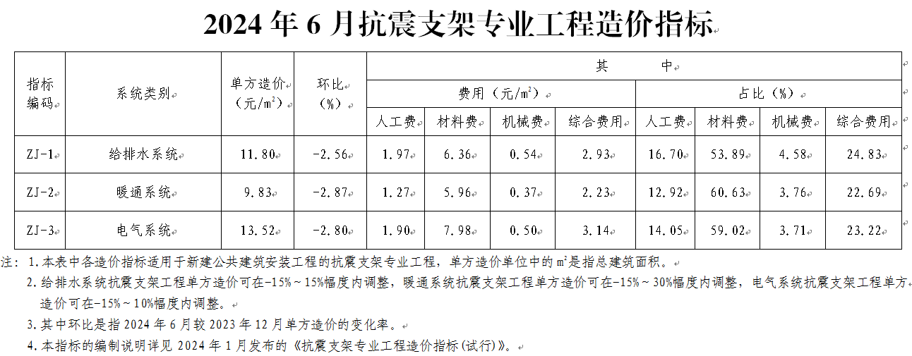 北京市住房和城乡建设委员会发布《2024年6月抗震支架专业工程造价指标》