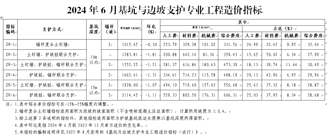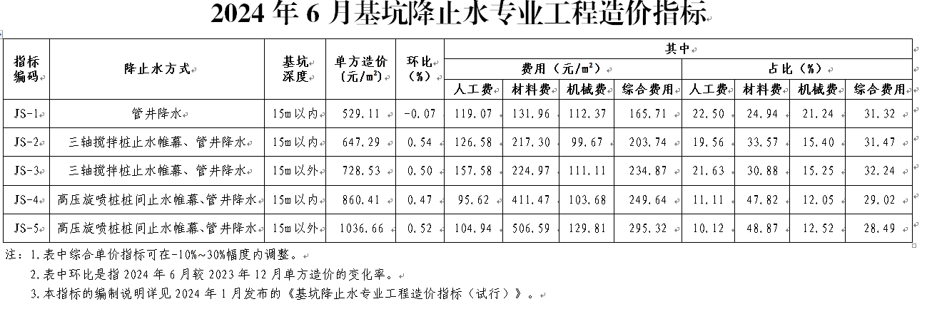 北京市住房和城乡建设委员会发布《2024年6月基坑与边坡支护专业工程、基坑降止水专业工程造价指标》