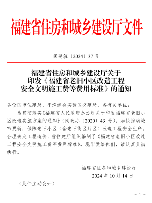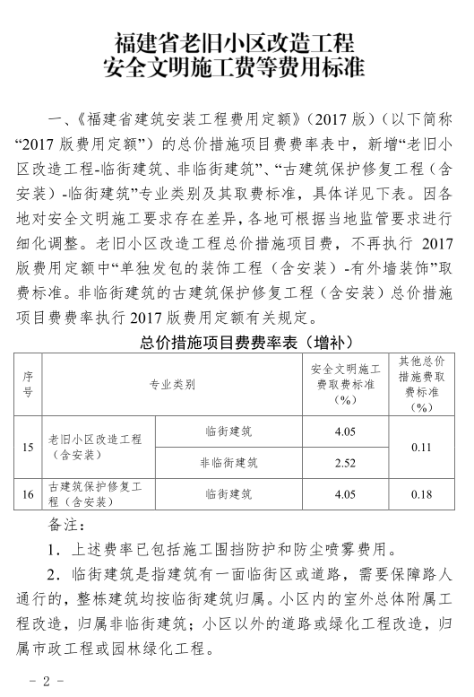 福建省住房和城乡建设厅关于印发《福建省老旧小区改造工程安全文明施工费等费用标准》的通知