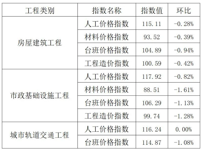 现发布我省房屋建筑工程、市政基础设施工程和城市轨道交通工程20249月人工价格指数和台班价格指数;以及房屋建筑工程和市政基础设施工程材料价格指数和工程造价指数如下