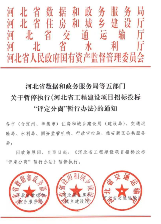 日前,河北省住建厅、数政局等5部门联合通知:因政策原因,自即日起,《河北省工程建设项目招标投标评定分离暂行办法》暂停执行