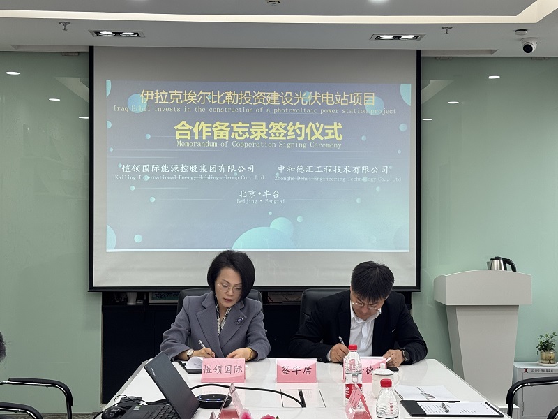 3月11日下午,愷领国际能源控股集团有限公司(以下简称愷领国际)与开云手机登录入口(以下简称中和德汇)在北京丰台正式完成了关于伊拉克埃尔比勒光伏电站项目的签约仪式。