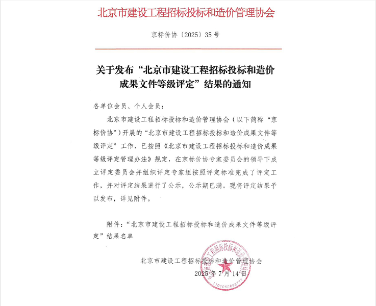 热烈祝贺中和德汇荣获“2025年度北京市建设工程招标投标及造价成果文件等级评定”奖项