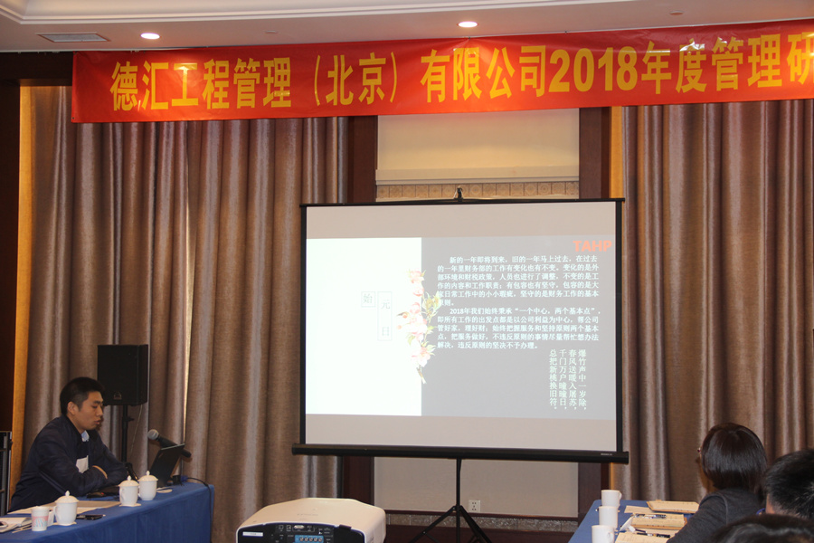 2019年126日,德汇工程管理(北京)有限公司在龙熙温泉酒店召开了2018年度管理研讨会。会议由副总经理谭挺主持,公司管理层21人参加本次会议。